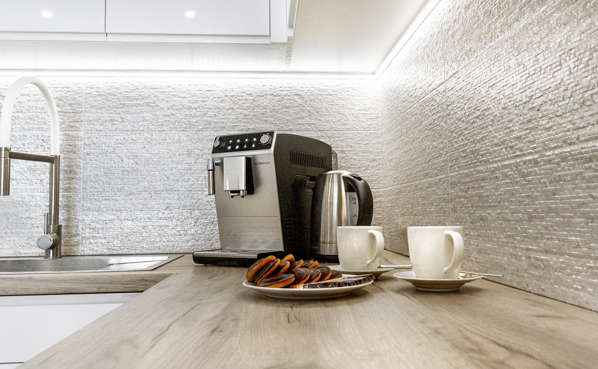 Apartament jest w pelni wyposażony i umeblowany. Sklada sie z dwóch sypialni z podwojnymi lozkami, stylowego salonu z rozkladana sofa przystosowana do spania, łazienki z kabina prysznicowa oraz aneksu kuchennego. Do apartamentu przynaleza rowniez dwa obszerne tarasy. Do dyspozycji gosci sa dwa telewizory z dodatkowym dostępem do platformy cyfrowej Netflix oraz szybki internet. Całkowita wielkość apartamentu to ponad 60 mkw, co czyni ten apartament największym w całym budynku.
